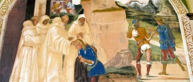 On the left in the background you see the young Valerian and an unknown friend, intent to eat. On the right we see the young man, who every year went fast at Monte Cassino, standing next to the friend depicted with horns, and cripple sbracato (that reflects the devil and temptation). In front of the main scene on the left, with St. Benedict granting forgiveness.
