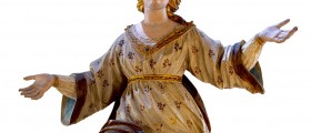 Legno intagliato e policromo, altezza 230 cm.