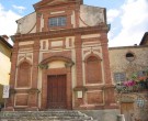 L'interno è caratterizzato dalle pregevoli ornamentazioni in stucco, tra cui sei statue di Santi; sull'altare principale si trova un dipinto seicentesco con Gesù inchiodato alla Croce di Giovanni Antonio Cerretelli; l'altare laterale destro conserva una tavola con lo Sposalizio della Vergine, della bottega di Luca Signorelli.