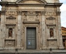 The building, raised in 1595-1604, has a Latin cross plan, a single nave with a dome in the center of the presbytery and a marble facade. The structure of the façade is divided into three parts by pilasters, divided into two levels by a cornice and culminating in a central tympanum and two lateral volutes.