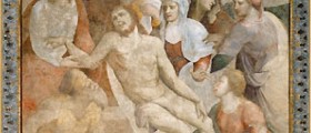 nelle espressioni solenni di Nicodemo (in basso a sinistra), Giuseppe d’Arimatea (in alto al centro) e di San Giovanni Evangelista che, lo sguardo basso e pensoso, sorregge il braccio ormai privo di vita del Cristo.