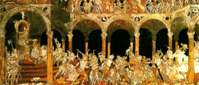 King Herod is seated on a splendid throne Renaissance carved marble, and commands his soldiers to carry out the massacre. The construction technique is different from that used in the aisles for the use of a greater number of colored marbles, used to create zones of shadow and light in accordance with a procedure which is then perfected in the scenes drawn from Beccafumi.