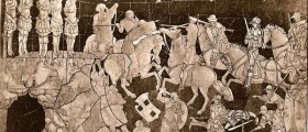 The Tarsia shows the battle between Jews and Amorites, surmounted by trefoil arches arches. On the left, above the cave where they had taken refuge, we see the figures of five kings of the Amorites hanged.