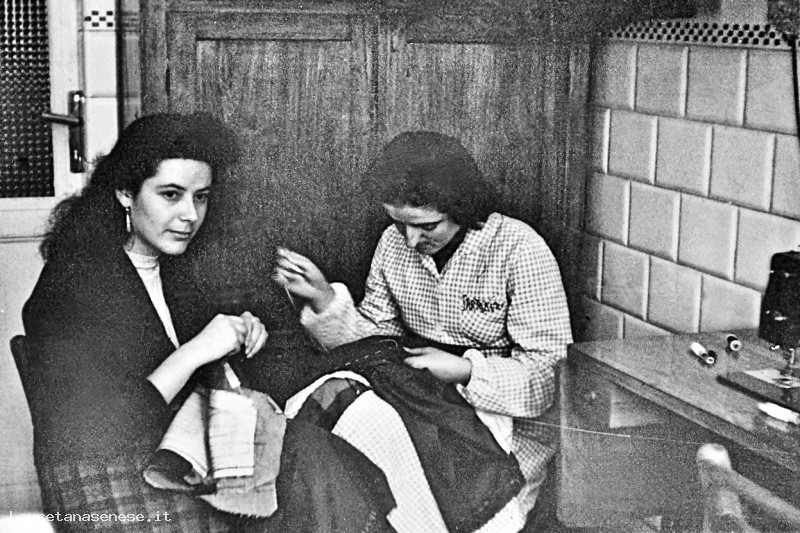 Due collaboratrici della Sartoria Pieri intente a fissare con le filse le parti di un vestito, prima di passare alla fase di cucitura a macchina. Sulla destra si intravede la testa con l'ago di una macchina da cucire a pedale. Le sarte sono:
