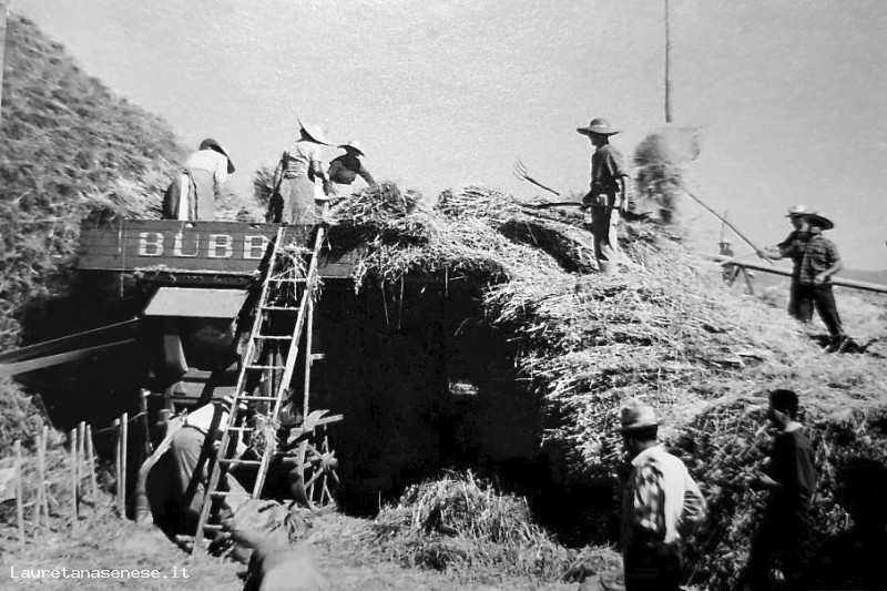 Bella foto d'insieme della trebbiatura effettuata nell'aia di Scacciacucculi, allora appartenente alla Fattoria di Poggiopinci.