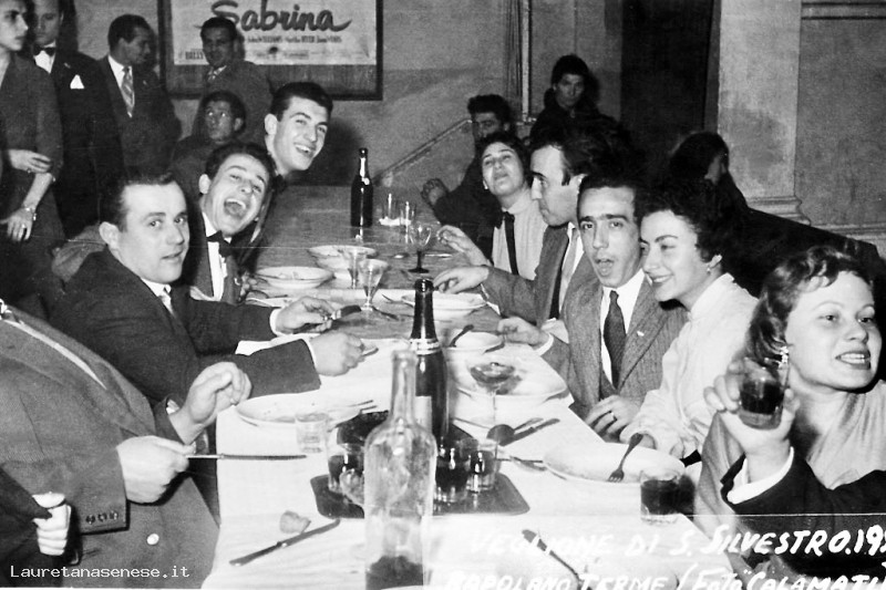 Capodanno 1956, il solito gruppo di amici seduto allegramente a tavola fuori dal al Teatro Ravvivati.