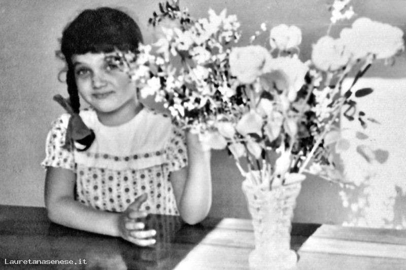 Bellissimo ritratto di bambina inconsuetamente immortalata accanto a un vaso di fiori in cristallo.