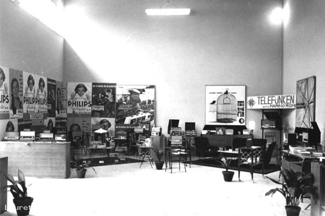Foto panoramica che ritrae 2 dei 4 stands presenti all'interno della palestra delle scuole elementari. La mostra fu organizzata in occasione della attivazione dei nuovi canali radio in Modulazione di Frequenza (FM). Infatti fino ad allora esistevano solo trasmissioni in Onde Medie e Onde Corte, spesso molto disturbate.