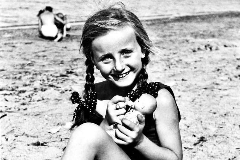 Una piccola Eleonora Vanni, sulla spiaggia di Marina di Grosseto, che gioca a fare la mamma con il suo bambolotto.