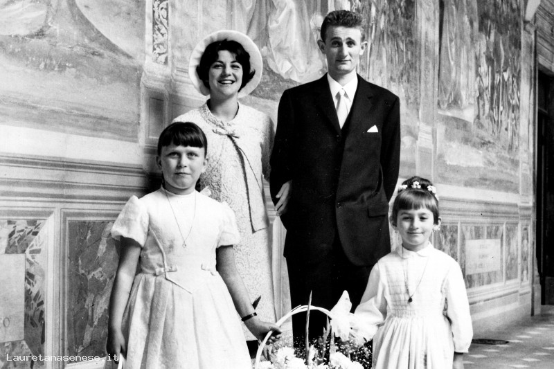 prima di lasciare MonteOliveto, luogo dove hanno scelto di sposarsi, hanno scelto di fersi ritrarre nel contesto di maggiore bellezza dal punto di vista artistico: il chistro affrescato con le storie di San Benedetto. Insieme a loro, le due piccole damigelle delle quali non conosciamo il nome. Chi ci può aiutare?
