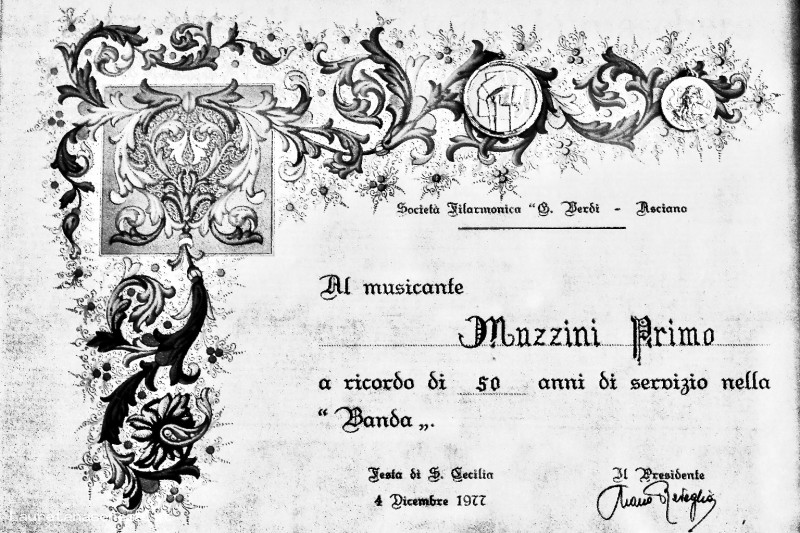 Primo Mazzini, il destintario dell'attestato, a quella data, aveva svolto la sua attività volontaria di musicante per oltre 50 anni in maniera continuativa, all'interno della locale Filrmonica Giuseppe Verdi.