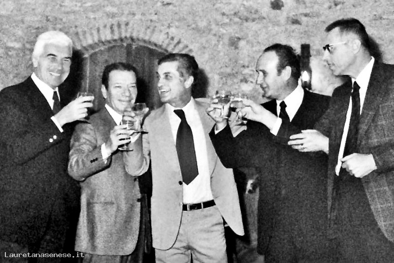 Tullio Nascosti cugino di Hervè Pagliantini, in mezzo con il vestito chiaro, brinda con gli amici al suo matrimonio.