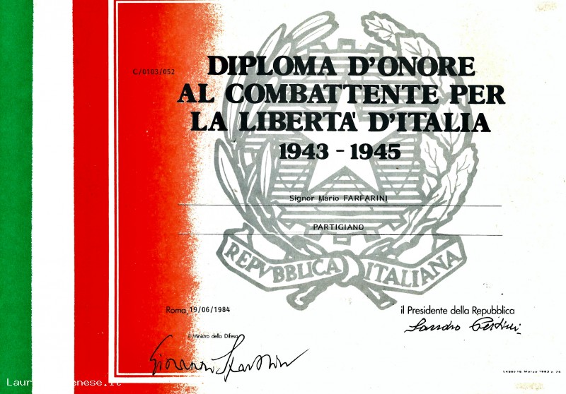 Si tratta del DIPLOMA D' ONORE connesso alla sua effettiva partecipazione alla lotta partigiana, in ambito locale.