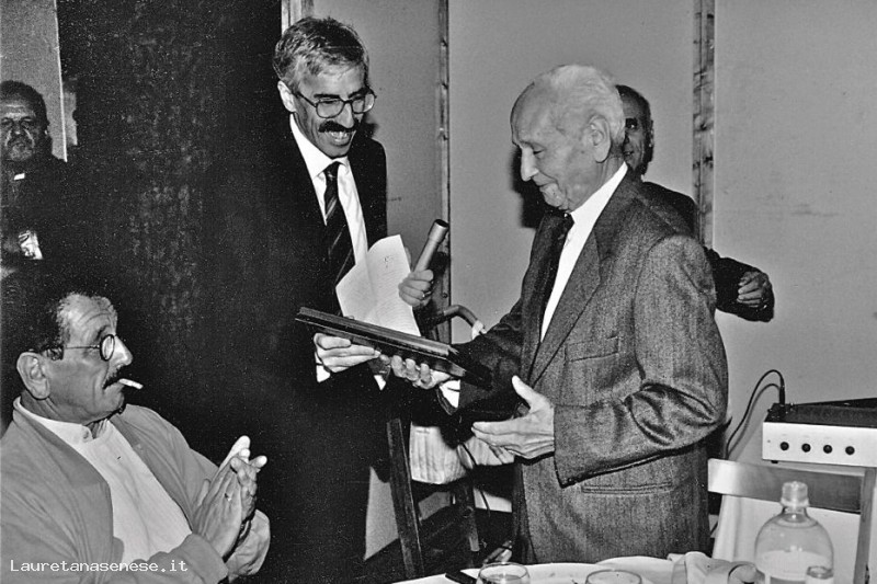 Marco Maffei, in qualità di Presidente Pro Loco, consegna una targa ad un Enrico Radicchi visibilmente commosso.