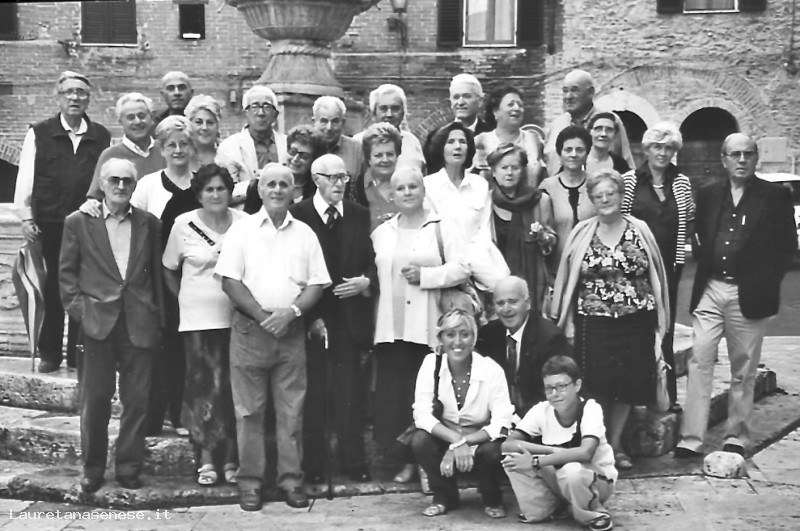 Classica foto di gruppo dei nati nel 1931 e relative consorti, davanti alla fontana di Piazza del Grano, classico simbolo dell'Asciano popolana.
