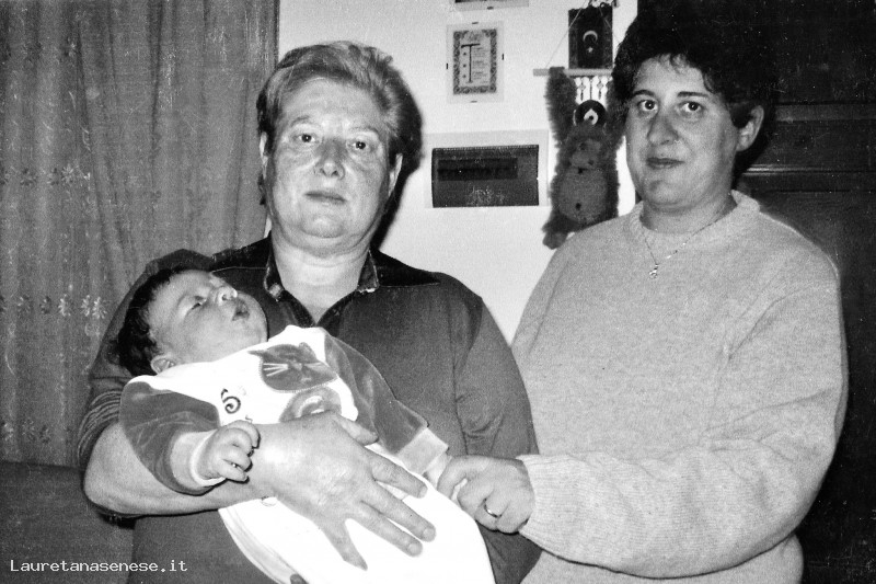 Il piccolo Alfredo Lanini, ben protetto da una calda tutina, in braccio alla nonna Rosa con accanto mamma Giovanna Granato.