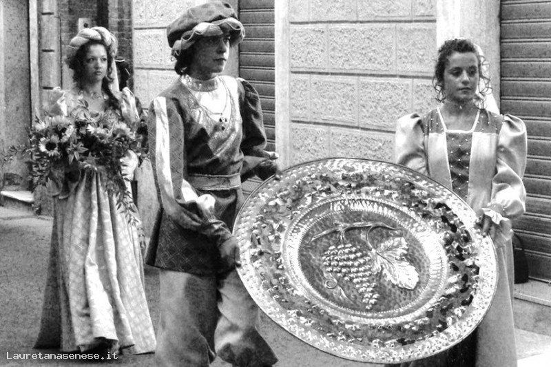 La Contrada è sicuramente quella della Pergola che sfila con un grande vassoio di rame magistralmente lavorato a sbalzo.