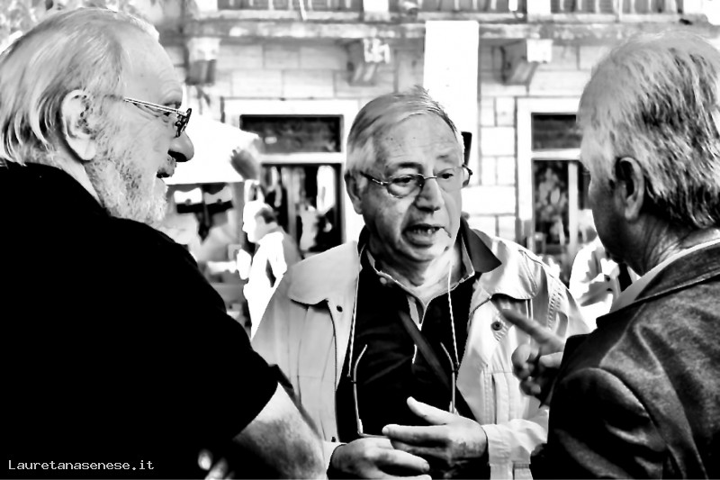 Enzo Giannettoni, principale organizzatore del raduno dei nati ad Asciano nel 1947, conversa in piazza Garibaldi con due coetanei: