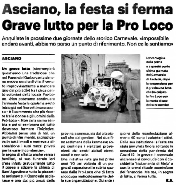 In questo contesto, di sincero e diffuso dolore per lo scomparso e la sua famiglia, la Pro Loco, di cui Giuliano era un socio molto attivo, ha deciso di cancellare  le due domeniche rimanenti del Carnevale di Meio, in segno di lutto.