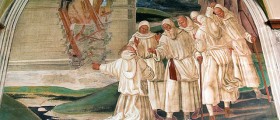On the left is the home of Florenzo destroyed by the devil, the devil is in the sky away after stealing his soul. In the foreground St. Benedict that monks inform Fiorenzo died under the rubble of his house.