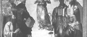 At the top of the composition are the four Prophets: (from left) Solomon, Isaiah, Ezekiel, and David. Below are the four Fathers of the Church: Gregory, Augustine, Ambrose, and Jerome. Standing, probably Joachim and Anne. Kneeling, a Franciscan saint (Anthony of Padua?) and a bishop saint, recently recognized as Saint Anselm of Aosta. Carli (1773, BCS C.VII.10, c. 19v.) also mentions a predella, now lost, believed to be by Peruzzi, which was broken up into small panels and sold to the Azzoni family. Regarding the various attributions, Perini attributes the painting to Giacomo Pacchiarotti, Brogi suggests Girolamo del Pacchia, Massari Riccio, and Metz Domenico Beccafumi. Regarding the dating, Bisogni proposes this altarpiece as one of the various works commemorating the victory of the battle of Camollia (1526), the merit of which was attributed to the Immaculate Conception, and mentioning the panel by Giovanni di Lorenzo Cini in S. Martino, which celebrates the same event and is dated 1528, suggests a closeness to this one. Instead, Sricchia-Santoro, supported by Bagnoli, objects that the complex theological framework of the panel, its peripheral location, and the lack of reference to the battle of Camollia suggest a connection with the subsequent events of the 1530s, influenced by the direct presence of Peruzzi.