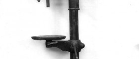 Questo trapano, ancorato direttamente sul pavimento della bottega, potefa essere usato su oggetti di grandi dimensioni, semplicemente regolando ol piano d'appoggio.Il moto gli era trasmesso attraverso un collegamento a cinghia con pale alimentate da salti d'acqua e , solo successivamente con un grosso motore elettrico trifase che attraverso barre aeree di trasmissione forniva forza motrice a tutte le macchine operatrici di una bottega.
