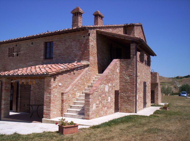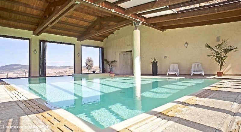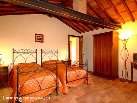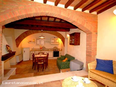 A wonderful village situated at the top of one of the gentle hills which follow one another in the heart of the Crete Senesi. From every corner of the building there are views that take one’s breath away. Two of these buildings are divided into 8 wide apartments and all of them have an independent entrance and a private external space furnished with table and chairs for outdoors eating. The inside of each apartment is very comfortable: the fired-brick floor, the decorative wooden beams and the furniture in Tuscan style, match with modern kitchens and the bathroom. The apartments are provided with a washing machine and a satellite TV ,air conditioner (in the first floor apartments). On the inside of an old hut, it has been created an indoor swimming pool with an hydro massage bath. Two of the building’s walls and a side of the roof are covered by glass walls which can be completely opened during the summer. Thanks to the possibility to warm up the water, the swimming pool can be enjoyable all the year round. The swimming pool is opened in high and in-between season and closed in low season. It is heated in winter. Dinners on request are available only for groups of at least 10 people. Apartment’s heating according to its consumption, payment “in loco”.