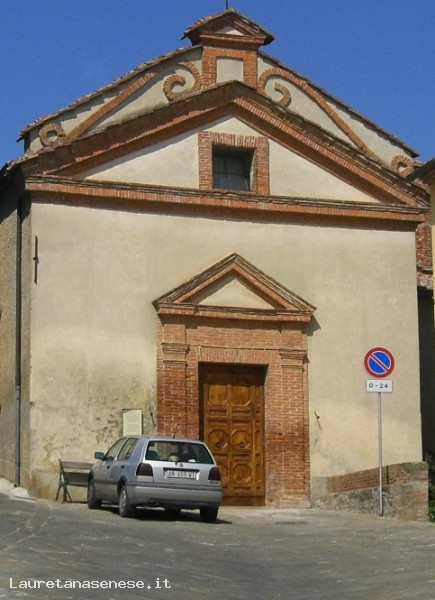 The plaster facade emphasizes the brick decorations, highlighted by three triangular spandrels, from which spring out from the lower part two segments that terminate with volutes. The interior is made up of a single space with a semi circular arch on the back wall, supported by two columns with Ionic capitals; the choir behind the arch follows its design with a barrel vault. Among the many paintings, the following stand out : “ The Annunciation “ by Santi di Tito (XVIth century), “The Ressurection” by XVIIth century Florentine School, “ The Madonna of the Rosary with Saints” attributed to Rutilio Manetti (XVIIth century), “The Grieving Madonna with Saints” by the sphere of Ventura Salimbeni (XVIIth century) and a good reproduction of “The Madonna of the Cup” by Correggio, realized at the end of the XVIIth century.