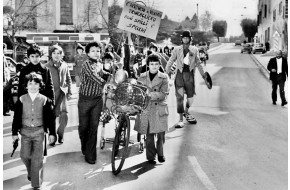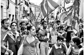 Particolare della Tribbiatura in Piazza Garibaldi, che evidenzia il motto scritto sul retr...
