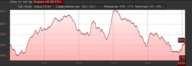 It starts from Montepulciano in the direction of sports which goes past the right on a dirt pleasant saliscendi.per reported in approximately 1 km and a half. Leave the main dirt road that goes back to the intersection of S. Biagio to bend to the left again on excavation at the farm Arden turn right uphill on a dirt road that runs along susineto field and that leads us in a short asphalt linking Chianciano Montepulciano, and the cross towards the industrial area and Totona at a crossroads go straight on asphalt in the steep climb we follow the road until it comes down to right and just past a farm, turn left on dirt road field (barrier) follow up to a flat stretch of abandoned farm (bar) where you go left in the firm and bumpy downhill. Once in the valley climb laboriously up the hill to enter a forest after about 300m you come to a fork where you turn left again on a very steep climb. Once out of the woods paves the way for granting us a little breathless and wonderful views, the villa is exceeded pianoia and continue on the road There comes hours dirt road that leads to an asphalt road that must be taken after a left at the first intersection you go strappetto right in the direction of Mary Magdalene hermitage that we reach after turning left at a building and a wide dirt path uphill through the woods. Once you reach the hermitage we recommend a visit to the incomparable beauty of the place, the track continues along the walls of the convent of trail and then take another left on very rocky trail initially continue through the woods in a fairy tale leaving a first turning right and going right to the next, the path was a clearing in the woods and go straight downhill piu'avanti then you go right then left again downhill paths emerging from the left and we put on a wide dirt road, then steep descent before light. After passing a villa with a sharp left turn right going around the farm and after passing a bar we go decidedly downhill to the valley go up the hill with some hard to tear up and get out into the woods about 1km after piu'avanti up and down the farm drive along the beautiful lift with beautiful views over the reserve and Castelluccio nat.di Pietraporciana until you reach a dirt road and follow it uphill to the right first and then up and down. We arrive in the asphalt loc.Pianoia gia'percorso we had before, but omit the deviation than before continuing to the hermitage on the tarmac after about 3 miles of false flat descent brings us to the junction of white villa we left and arrive quickly at the junction of s.biagio. continue straight on road with cypress trees reaching the temple go around taking away the reeds on the left that we follow through. After passing under 2 bridges you go to the stop right after reaching the starting point of around 700m.