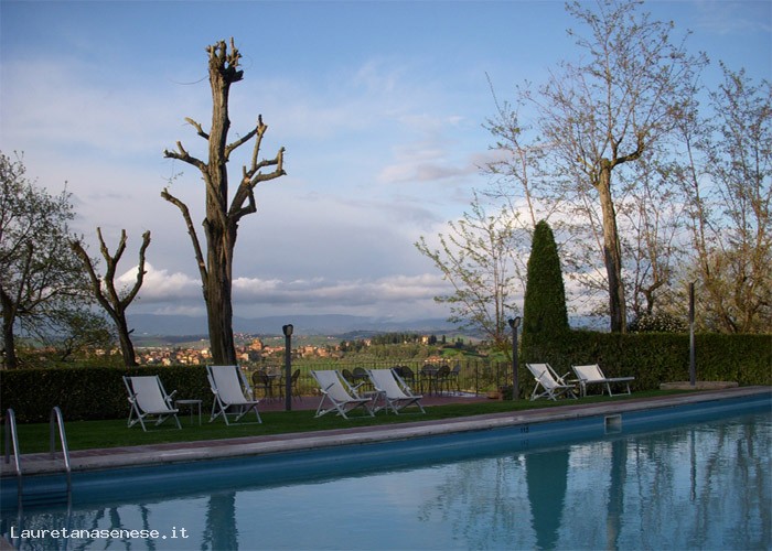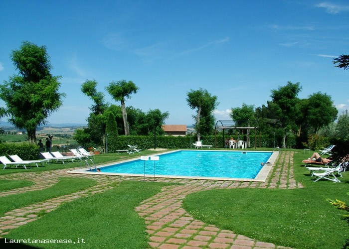 Nel verde del prato si inserisce la piscina scoperta, corredata di sdraio, lettini e tavolini.