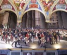 From the courtyard of the Palazzo Publico you access to the Museum, which houses beautiful paintings and sculpture along with paintings of extraordinary artistic and documentary value of the famous Sienese school of painting. Go up two flights of stairs at the entrance of the Halls was monumental, and turning immediately right you enter the room of the Globe, the main core of the building, having been a long time for meetings of the General Council of the Republic. The name comes from a lost painting by Ambrogio Lorenzetti rotating map, which depicted the ancient territory of the Republic. From this room began: the decoration of the Palace, is located on the back wall fresco by Simone Martini, the magnificent "Majesty" of 1312-15, still remarkable for the delicacy of chromatic chords, for the purity of the lines. And 'the first masterpiece of the famous painter, who on the back wall effigiò several years later in 1328 the portrait of the leader "Guidoriccio da Fogliano" conquerors of the Castle of Montemassi. Besides, the beautiful room of the Nine, where once met the Government of the Nine, who in 1337 commissioned Ambrogio Lorenzetti to decorate the room with the cycle of frescoes known as "The allegory of good and bad government." Returning to the room of the Globe, it passes to the left, nell'Anticappella, formerly used as a hall of the Consistory, ospitandone offices. In 1415 Taddeo di Bartolo, was commissioned to decorate it with a series of paintings of "Virtue and Of Famous Men." A beautiful gate closes the fifteenth century chapel, built early in the fifteenth century, much broader than that found on the ground floor, as it had to meet the new demands of a religious community that Siena was always more to increase. Of its decoration was still charged with Taddeo di Bartolo "Stories of Our Lady." The adjoining room to move or "Cardinals", introduces us to the Consistory Hall, with marble interior door Bernardo Rossellini. The frescoes on the ceiling, brilliant colors, are Domenico Beccafumi, whose subject us back again to the theme of justice and the love patriotism. Next to the Consistory Hall is the Hall of War or Priors, adorned with frescoes by Spinello Aretino, illustrating the "Life of Pope Alexander III of Bandinelli." Following the Hall of the Risorgimento, known as the Hall of Vittorio Emanuele II, inaugurated in 1890, whose walls are completely frescoed by Sienese painters of late nineteenth century, with episodes of the Unification of Italy. Upstairs is a large lodge, which looks to the south of the city. Finally, recently established at the adjacent rooms, houses the picture gallery, there are numerous frescoes, tables and paintings belonging to both the Sienese school and to other Italian and foreign artists.