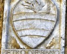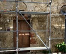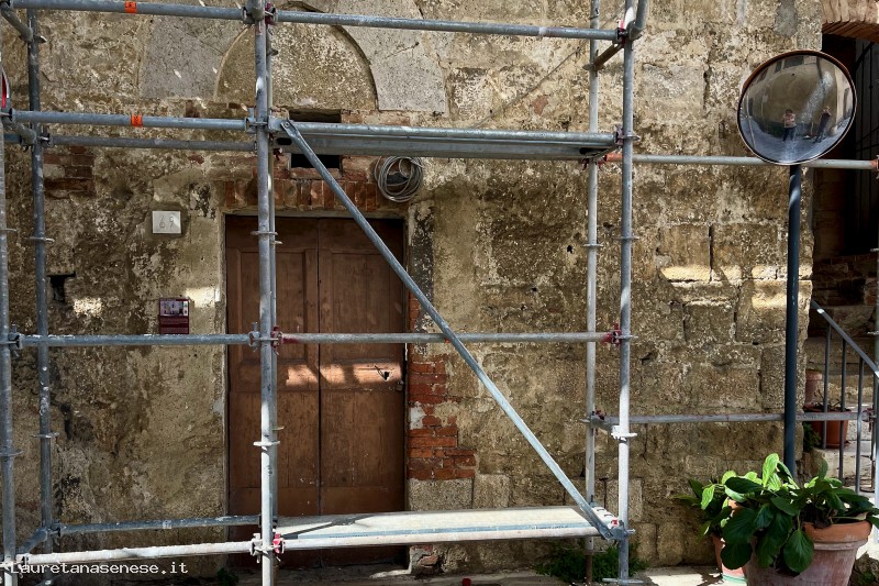 This building, originally the biggest tower in the town walls, was for at least three centuries (from the 1300s through the 1500s) the seat of power in Asciano, as demonstrated by the many aristocratic coats of arms embedded in the façade. Located at the corner of the Piazza del Grano (the Grain Square), it was well situated to keep a close eye on the local merchants. After having been made over as a theater for the town, it is now in a state of abandon.