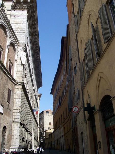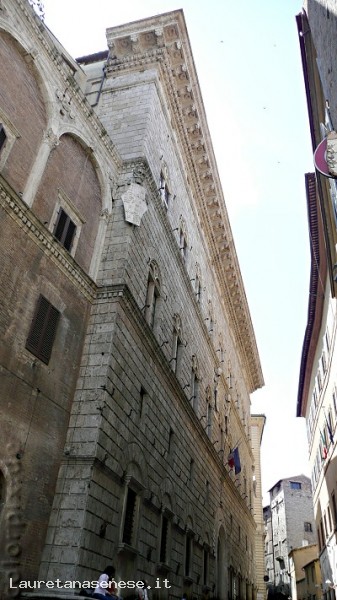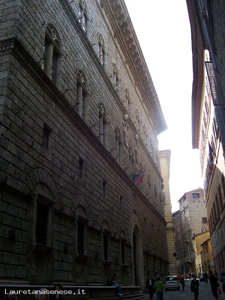 Il palazzo è uno dei pochi edifici in puro stile rinascimentale fiorentino. Venne costruito per volere di Giacomo e Andrea Piccolomini, nipoti di Papa Pio II, il palazzo fu probabilmente progettato da Bernardo Rossellino, importante architetto dell'epoca, mentre i lavori furono diretti da Pier Paolo del Porrina. L'armoniosa facciata in pietra presenta due stemmi dei Piccolomini ed è coronata da un elegante cornicione, decorato con le armi dei Piccolomini. Nel cortile interno spiccano i bellissimi peducci. Il palazzo dal 1858 ospita l'Archivio di Stato, uno dei più ricchi d'Italia, con circa 60.000 pergamene di enorme valore, antichi atti e codici dell'ottavo secolo, antichi documenti di Stato del periodo dal 1100 al 1800. Inoltre, a Palazzo Piccolomini ha sede il Museo delle Tavolette di Biccherna, che espone una raccolta delle tavolette di Biccherna e Gabella, antiche amministrazioni finanziarie di Siena. Di legno dipinto, le tavolette venivano usate come copertura dei registri contabili.