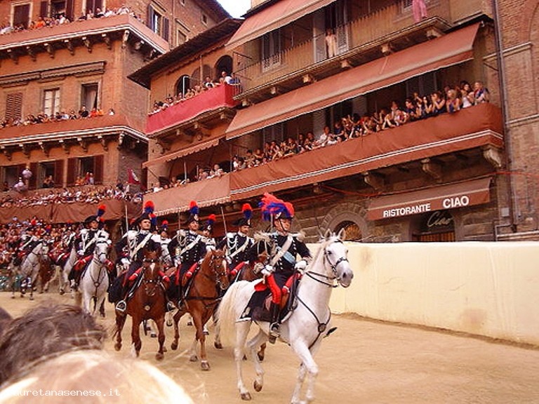 In ricordo della memorabile battaglia di Montaperti (1260) e dello scampato pericolo, i senesi decisero di indire il famoso Palio, ritenuto oggi da molti la manifestazione e festa storica più importante e rinomata d'Italia. La storia del Palio di Siena è però più articolata e complessa, e affonda le proprie radici in un'epoca ancor più remota. Nelle città italiane del XII e XIII secolo era usanza organizzare corse di cavalli, sia come spettacolo pubblico, sia come competizione tra i diversi allevamenti equini posseduti dai nobili cittadini e non. Parallelamente ai palii dei nobili, i cittadini di Siena cominciarono ad organizzare, più o meno spontaneamente, altre competizioni nei modi più disparati. L'organizzazione su base rionale della Festa e delle comunità trova la sua origine, nel tipo di organizzazione territoriale delle compagnie militari che caratterizzava l'esercito senese medievale. Quando non c'era la guerra, questa organizzazione si riversava nella competizione. La corsa del Palio prende il nome dal premio: il Palio, dal latino pallium (mantello di lana), era in genere un drappo di stoffa molto pregiata che veniva utilizzato per gli scopi più svariati. A Siena, in genere, era destinato alla chiesa del rione vincitore. Poteva essere utilizzato sia come arredo per la chiesa stessa. Questo avveniva perché, ai loro albori, le Contrade si appoggiavano per le loro riunioni alle Parrocchie o alle compagnie laicali che sostenevano e supportavano gli ordini monastici. È comprensibile come, in caso di vittoria, il premio venisse regalato alla Chiesa del rione, sia per riconoscenza sia per devozione. È dal Settecento che si afferma l’idea del Palio-dipinto e solo dopo la Seconda guerra mondiale che a dipingerlo vengono chiamati non più i bravissimi artigiani senesi ma pittori di fama nazionale e internazionale.
