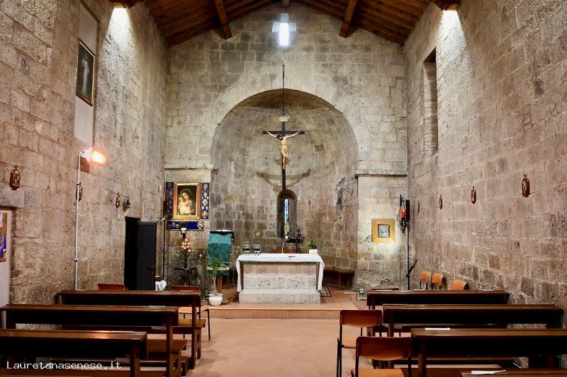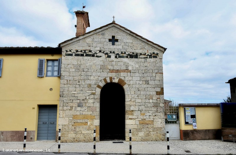 Isola d'Arbia, the place so named because, like Abbadia a Isola, it probably stood on land above the surrounding aquifer, preserves this small church, with a Romanesque façade decorated with two-tone arches. The vault of the small portal is also two-tone. A small cross-shaped window opens above the arches, and the bell tower is gabled.