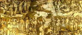 Bottom center, Moses raises his boards over his head for scgliarle sending her to the ground in pieces. Meanwhile in fact the people of Israel disobeyed him because the elders of Israel, in the top left, trying to convince Aaron to give Israel a new divinity. This is done in the lower register, where the Israelites left spilling gold and jewels on the fire forging the golden calf that you see to the right, the people here loves it, angering Moses is just down from the mountain where he had the divine revelation . Top sinners are points with the plague, dying spasms (Exodus 32, 27-28).