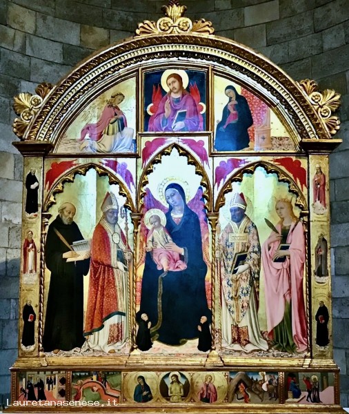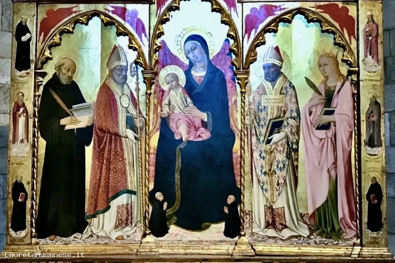 The altarpiece, painted late in Sano di Pietro's life, was created for the church of Abbadia in Isola, commissioned by Don Benedetto and Don Francesco, both monks of the monastery, who are depicted at the feet of the Virgin, on a much smaller scale.