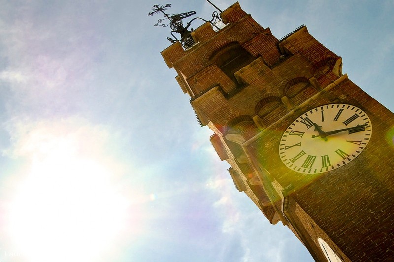 The municipal tower is located ideally in the center of the new part of the town that was extensively developed during the Renaissance.  It is known the tower was completed in 1586 thanks to a stone inscription still visible at its base. At the same time there was built a new fountain able to supply water to the residents of the new dwellings that grew up along the present-day Corso Matteotti.