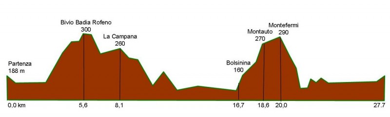 Da Asciano si pedala lungo la provinciale per Monteroni per circa 14 chilometri fino al punto in cui, a conclusione di una seconda lunga discesa, si incontra sulla sinistra, laddove inizia il tratto pianeggiante che porta a Monteroni, una strada bianca in pianura. La strada che procede parallelamente al fiume Arbia, porta prima al Caggiolo e poi a Bolsinina. Da qui fino a Montauto, la strada continua in salita con qualche tratto che presenta pendenze significative, ancora una volta è da segnalare la bellezza dei panorami che si aprono su di un territorio che, come pochi altri, cambia tonalità e sfumature ad ogni stagione. Dopo Montauto, la strada verso Asciano continua con una discesa molto ripida nel tratto iniziale e poi, raggiunta la vallata dell’Ombrone, si arriva sulla provinciale che abbiamo fatto all’inizio di questo itinerari oin senso contrario, raggiungendo nuovamente Asciano.