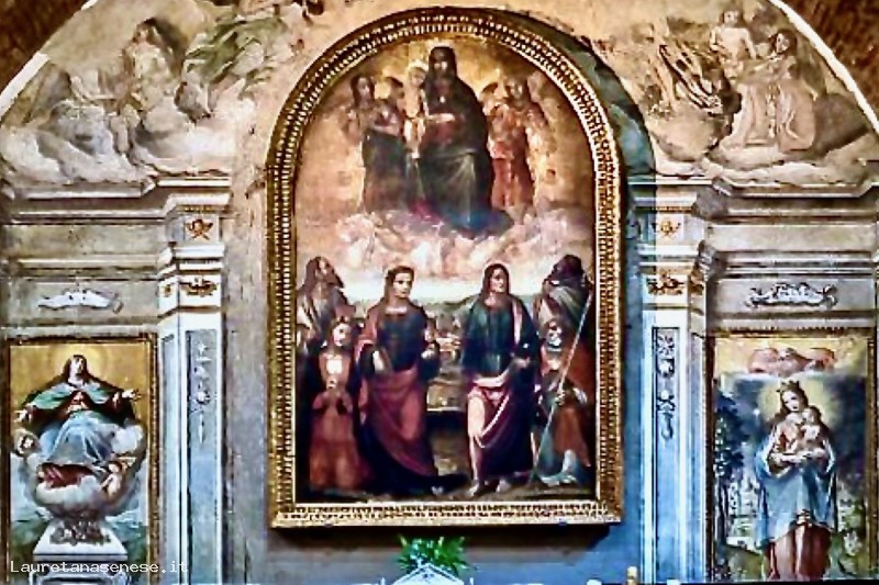 Pala della bottega del Sodoma, raffigurante la Madonna col Bambino, angeli e santi è posta dietro l’altare sopra il coro ligneo. L’opera è inserita all’interno di una finta architettura, dipinta a fresco, su cui spiccano due scene mariane: l’Assunzione della Vergine e l’Incoronazione di Maria.