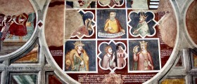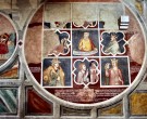 The room, located on the first floor of the building, is among the works of enlargement of the building carried out at the turn of the thirteenth and fourteenth centuries. The great room, which was probably used to study commercial and administration of local justice, presents a colorful decoration faux marble accompanied, in the upper part of the walls, a rich sequence of coats of arms. Within this system decorative decorative, fit three large medallions with figures: Round of Aristotle - The largest of the three paintings on the north wall of the room, is the starting point of the illustration illustrations. There stands a half-bust of Aristotle, identified by a cartouche with. The picture is surrounded by the four Cardinal Virtues (Prudence, Justice, Fortitude and Temperance) and four sides by historical or mythical figures who, in their stories, are an example of the virtues themselves. These are now seriously damaged as well as most of the inscriptions. In quatrefoil below, is depicted a man pointing a hand ax and regent in the background a tower. SSI is certainly a symbolic reference to the town of Asciano. The scene as a whole is intended to enhance the common good that should be the main goal of those who manage the power, as Aristotle teaches, and that is achieved by good behavior, especially in terms of justice. Round of Solomon - The medallion to the left of the "Round of Aristotle" depicts the biblical story of the Judgment of Solomon, enlightened by divine wisdom. The scene shows two mothers who had given birth on the same days and lived in the same house, and that, following the death of one of the two children, they accused each other of having exchanged their dead son live with. Solomon, to prove who the real mother would have divided in half with his sword the child is depicted identifies the natural mother, recognized that in order to save his son, he asks the king to hand begging the other woman. Round of Nebuchadnezzar - Ilprimo Dream of Nebuchadnezzar, narrated by Daniel the prophet, is rappresentatoAlla the right of the "Round of Aristotle." The episode, from the Old Testament, showing what appeared to the king in a dream: a large statue with the head of gold, chest of silver, its belly and thighs of bronze, its legs of iron, its feet partly of iron and partly of clay, is destroyed by the fall of a large boulder. Nebuchadnezzar was troubled by a dream, he summoned all the wise men of Babylon, and condemned them to death because they are unable to interpret the meaning of the dream. Only Daniel, was able to explain to the king that the dream anticipated the fall of his kingdom and the coming of the Kingdom of God in this sense, the Dream wants to mean an example of Christian condemnation riches and greed of those who govern, because destined to an inexorable fall. The iconographic representation continues into the east wall with a spectacular classical Rota Barlaam.