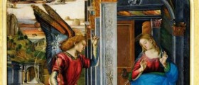 Commissionata al pittore nel 1490 per la cappella della compagnia della Vergine nella cattedrale di Volterra, venne terminata nel 1491, come certificano la data e la firma sul pilastro in primo piano. Si tratta di una delle opere più alte del periodo centrale di Signorelli ancora caratterizzato da asprezze disegnative e coloristiche ma forse per questo quasi una monade dall'algida bellezza. La vergine viene sorpresa dall'angelo in un portico e per la sorpresa lascia cadere a terra il libro che stava leggendo. Lo spazio invece di dilatarsi grazie alla prospettiva si comprime e verticalizza, in special modo nella corsa rapida dei pilastri e nel paesaggio sullo sfondo. La cromia dei marmi e delle vesti è tutta giocata su rossi, verdi e blu, fino ad arrivare alla nota raffinata e poetica delle piume di pavone dell'angelo. I panneggi quasi cesellati nel metallo creano tour de force sui corpi dei due protagonisti e l'occhio del riguardante si perde nella miriade di anfratti ombrosi creati dalle pieghe. Signorelli ripropone l'ambientazione tipica per l'Annunciazione dove inserisce i numerosi simboli mariani, dal pilastro alla porta aperta, dal ponte alla fortezza. Un bassorilievo con David che suona, incastonato sotto le volte del portico suggella la lettura mariana della scena.