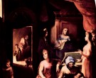L'affresco che misura 248 x 194 cm, è affiancato da paraste in legno decorate a grottesche.