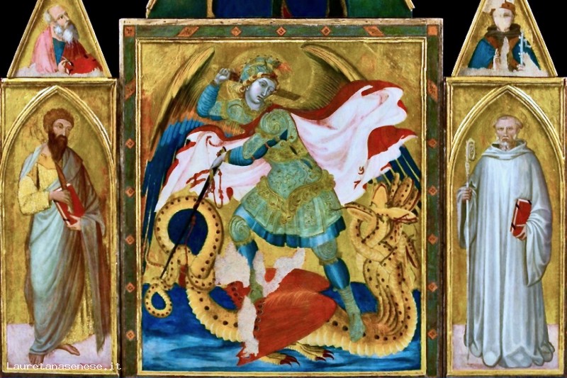 Il trittico rappresenta San Michele Arcangelo che uccide il drago e i Santi Bartolomeo e Benedetto. L'opera proviene dalla vicina Badia a Rofeno e fu realizzato dal noto pittore senese autore degli affreschi del Buongoverno nel Palazzo Pubblico di Siena, forse in tempi diversi.