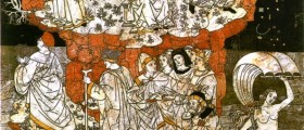 The Rector Alberto Aringhieri commissioned this scene full of characters to Pinturicchio in 1505, with the physical execution of Paolo Mannucci. Pinturicchio, which was paid on 13 or 15 March of that year, he was working at the same time the Piccolomini Library, apparently assisted by the young Raphael. The box shows a complex allegory of Fortune and Wisdom. The first is represented as a naked woman holding a foot on a sphere (symbol of volatility) and holds a cornucopia and the sail swollen by the wind, a symbol of success, rests her left foot on a boat broken tree, with the which a group of wise men came to the Hill of Wisdom, which dominates the scene. They, through a steep and studded with stones, small plants and animals, symbols of the vices, trying to reach the top of the hill where sits the Wisdom (or Quiet), bearing a book in hand and the palm of victory. On either side of Socrates, it is intended for the palm (whose suicide is seen as a martyr) and Crates, who is emptying into the sea a basket full of jewels and coins, a symbol of giving up the illusory happiness of material wealth. All around the sea looks stormy. The message of the allegory, which is already clear (virtue can be achieved but with difficulty) is also clear from the Sapienza cartouche above: Huc properate viri: salebrosum scanned montem pulchra laboris ERUNT rewards palm quies.