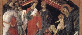 Tempera su tavola, cm. 42,5 x 43,5. In questa tavola, che chiaramente richiama le iconografie dell'arte bizantina, si percepiscono, soprattutto nelle figure - compresi i cavalli - poste al lato sinistro, preludi di notazioni da società 'cortese'.
