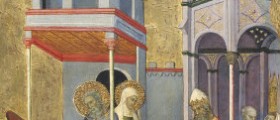 Il Pannello Gioacchino ed il mendicante, con la Natività della Vergine e la Presentazione della Vergine, erano parte di una predella, fascia dipinta divisa in più riquadri che faceva da corredo alle pale d'altare, dove vengono narrati in sequenza degli eventi. Questo che è il primo pannello, mostra gli anziani genitori di Maria, Gioacchino ed Anna che fanno l’elemosina ai poveri. Alla loro sinistra un prete sotto il portico del tempio dal quale Gioacchino ed Anna furono cacciati perchè senza figli, simbolo di disgrazia divina