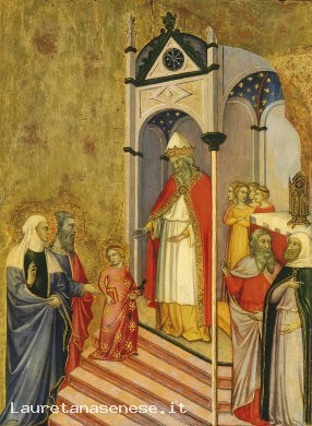 Terzo Pannello della Predella sulla vita di Maria, (fascia dipinta divisa in più riquadri che faceva da corredo alle pale d'altare, dove vengono narrati in sequenza degli eventi). Il pannello mostra la giovane Vergine che entra nello stesso portico del Tempio dove viene accolta dallo stesso Prete che un tempo allontanò i suoi genitori dal luogo di culto perché considerati indegni. La continuità da realismo alla scena malgrado nonostante l’oro sullo sfondo.