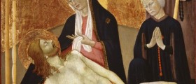 La tavola si caratterizza per il soggetto e l’iconografia decisamente insoliti che fanno del dipinto una sorta di ex voto: il corpo pallido ed esanime del Cristo è disteso sulle ginocchia della Vergine la quale, con gesto dolente, piange la passione e morte del Figlio al cui martirio fanno allusione la grande croce, il flagello appeso al chiodo, la lancia e la canna con la spugna con la quale i soldati romani diedero dell’aceto al Cristo morente. Inginocchiato accanto alla Vergine, le mani giunte in segno di preghiera, sta il committente dell’opera cui rimandano i due stemmi dipinti alla base della tavola, la cui individuazione ha permesso di riconoscere nell’anziano gentiluomo la figura di Peter Volckammer, ricco cittadino di Norimberga giunto in Siena al seguito dell’imperatore Sigismondo e qui deceduto il 5 settembre 1432. Dietro costui è San Sinibaldo che, in qualità di santo protettore della città germanica, tiene in mano un modellino simbolico di Norimberga. Inginocchiato accanto alla Vergine, le mani giunte in segno di preghiera, sta il committente dell’opera cui rimandano i due stemmi dipinti alla base della tavola, la cui individuazione ha permesso di riconoscere nell’anziano gentiluomo la figura di Peter Volckammer, ricco cittadino di Norimberga giunto in Siena al seguito dell’imperatore Sigismondo e qui deceduto il 5 settembre 1432. Dietro costui è San Sinibaldo che, in qualità di santo protettore della città germanica, tiene in mano un modellino simbolico di Norimberga. Il dipinto venne probabilmente eseguito poco dopo la morte del ricco personaggio, il cui corpo trovò sepoltura nel duomo senese: i due cimieri dello stemma dei Volckammer sono infatti privi della corona dorata di cui la famiglia ebbe diritto di fregiare la propria insegna a partire dal novembre del 1433.La tavola è stata riconosciuta dalla critica come una fra le opere più antiche dell’artista senese noto come ‘Maestro dell’Osservanza’. L’espressione assorta, vagamente imbambolata degli sguardi, il disegno netto dei profili e la predilezione per una pittura dai toni smaltati sembrano preludere alle soluzioni di Sano di Pietro della cui attività, secondo alcuni studiosi, i dipinti afferenti al gruppo ‘Maestro dell’Osservanza’ costituirebbero addirittura la più antica manifestazione.